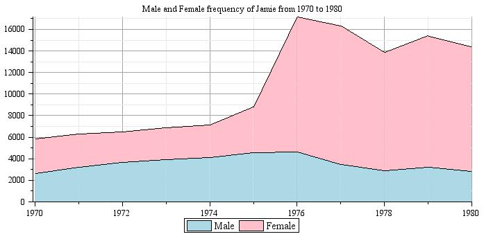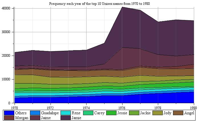 There was a giant spike in the number of children named Jaime and Jamie from 1975 to 1978.  Clicking on the largest purple region in the above plot in the worksheet give details for "Jaime" showing the spike is mainly due to an increase in baby girls with the name: