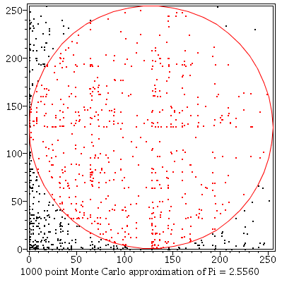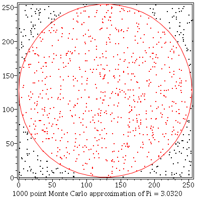 In a previous post, I promised to write about testing the quality of pseudo-random number sequences.  I'll post later about some of the statistical tests often used, but I first wanted to mention a sort of practical test one can do. One of the many things you might want to do with pseudorandomly generated numbers is Monte Carlo integration/simulatation/etc.  As mentioned by acer in this comment, Monte Carlo integration can be shown to work better with some of the pseudorandom number generators (PRNGs) which are considered inferior in a statistical sense.  In this post, we will play with a simple Monte Carlo approximation of π.