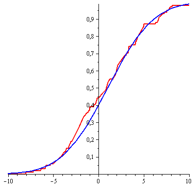 We begin from the Kolmogorov test. We find D[n]:=sqrt(n)*max{|F[n](x)-F(x)|:-infinity < x < infinity}, where F[n](x) is the ?ProbabilityFunction of RandomVariable(?EmpiricalDistribution(S)) of a sample S having the size n. Next we compare D[n] with the root t[0.95]=1.3580 of the equation K(t)=0.95: