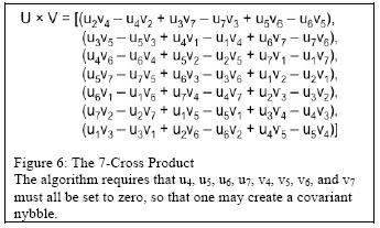 To make the covariant nybble we need to use a 7-vector cross product rather than the 3-vector cross product. However, the last four elements add no additional value, therefore, they are discarded. The dot product of the covariant nybble is composed of the sum of eight products (see figures 8, 9 and 10 for examples on visualizing the 3-cross and 7-cross products, and their joining or superimposing of each other).