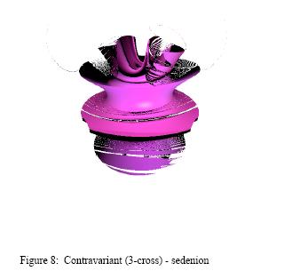Only where the slices meet at the extrema, is where both the contravariant and covariant cuts are equal. In a firstdegree calculus course, one uses a tool, such as a tangent line, to determine if the curve is increasing, decreasing, or at an extrema. Both the calculus and the contravariant/covariant technique provide visualization hints to the user. Nevertheless, when one move to dimensions higher than 3D, the calculus technique seems to fail us for providing visualizing aides. Yet, the contravariant/covariant technique is still programmable, by a computer, for aiding in visualizing. With 4D slices, one first has an abscissa space and ordinate space. Both spaces share the same abscissa hyper-plane. One shall call the abscissa hyper-plane the horizon, and thus a 4D cut parallel to the horizon is called the contravariant cut. One call each set of fours imaginary components a quaternion nybble (see figure 8, 9, and 10 for example of contravariant and covariant images).