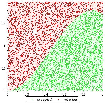 The process of accepting some of these values and rejecting others lends itself very well to a nice visualization. We will represent each of the sample values by a point in 2D, where the x-coordinate is the sample value t, and the y-coordinate is a uniformly distributed random value between 0 and g(t). By construction, these points are uniformly distributed over the area under the curve of g(t). (In the current example, that is trivial, but it also holds if Y is not a uniform random variable.) Finally the points that are under the graph of f(t) are accepted, and the others are rejected. This looks as follows in Maple.