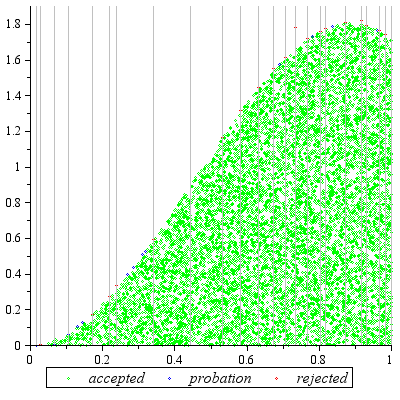 resetDispatcher := proc() local areas, i, sample; areas := [seq(i:-area, i in intervals)]; sample := ST:-Sample(ST:-RandomVariable(':-ProbabilityTable'( areas / add(x, x in areas)))); dispatcher := proc() return trunc(sample(1)[1]); end proc; end proc; generateValue := proc() local fx, i, interval, lowerbound, x, y; while true do i := dispatcher(); interval := intervals[i]; x := interval:-sample(); y := uniform01(1)[1] * interval:-upperbound(x); lowerbound := interval:-lowerbound(x); if y < lowerbound then accepted(rtable_num_elems(accepted) + 1) := [x, y]; return x; end if; fx := f(x); if y > fx or lowerbound < 0.9 * fx then splitInterval(i, x, fx); end if; if y < fx then probation(rtable_num_elems(probation) + 1) := [x, y]; return x; end if; rejected(rtable_num_elems(rejected) + 1) := [x, y]; end do; end proc;