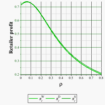 G2 := plot([L1, L2, L3], rho0 = 0 .. .8, color = ["#00FF00", "#00BC00", "#008000"], labels = [typeset(Typesetting:-mo("ρ", mathvariant = "bold"), "\n"), typeset("\n", Typesetting:-mo("Retailer profit", mathvariant = "bold", mathcolor = "black"))], labeldirections = ["horizontal", "vertical"], legend = [`#msubsup(mi("Pi"),mi("r"),mn("W"));`, `#msubsup(mi("Pi"),mi("r"),mn("D"));`, `#msubsup(mi("Pi"),mi("r"),mn("S"));`], axis[2] = [color = "#006000"])