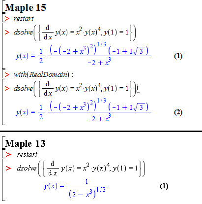 Question: Why does the same dsolve give correct result in Maple 13 and wrong result in Maple 15?