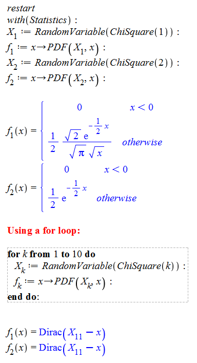 I am having a problem with a simple for loop. I cannot seem to figure out what is wrong. I want to define a number of Random Variables of the ChiSquare kind, with increasing number of degrees of freedom as the figure below suggest. When defining them one line after another everything works well. My idea was then to make a for loop, since I might want many Random Variables defined. It doesn't work however in the way I do it. All the PDF's turn out to be Dirac functions ... What am I doing wrong? It might be a basic thing about loops or the way the Maple Engine understand my statements, but I dare to ask the question anyway.