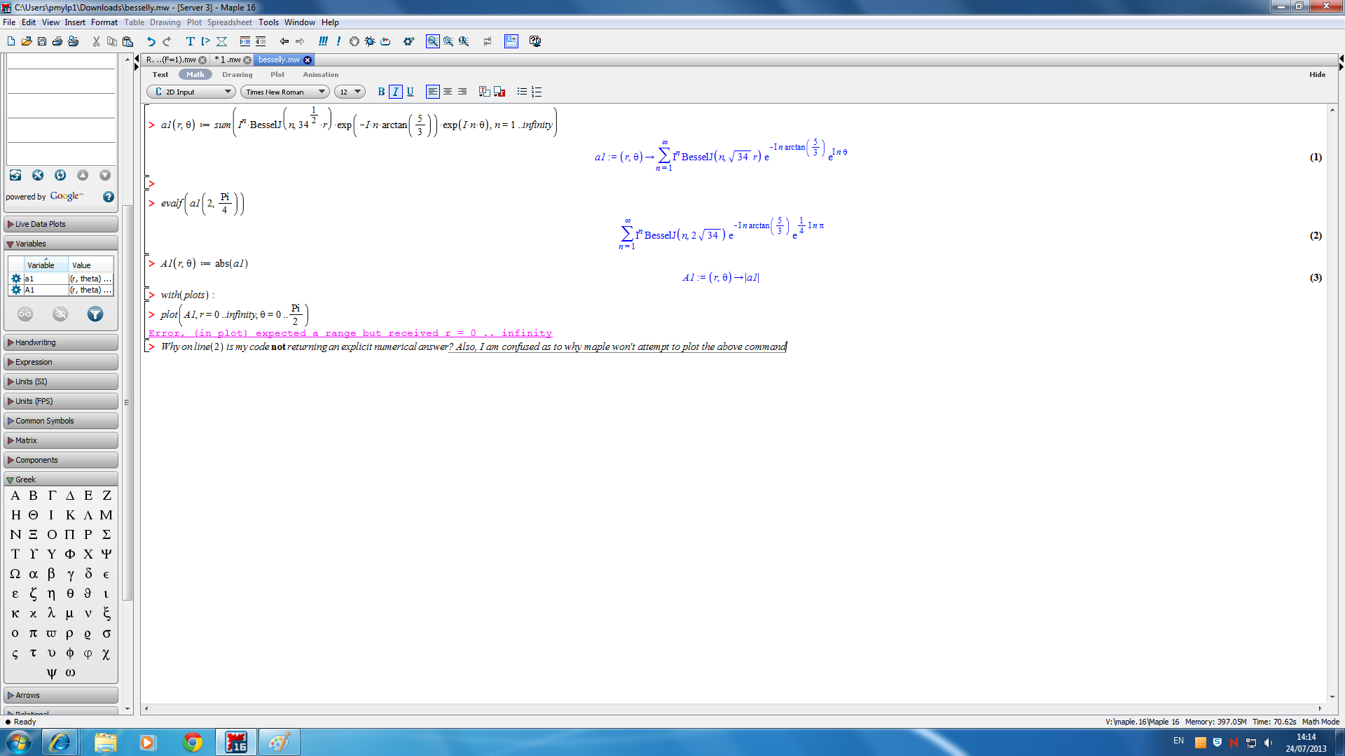 Question: Not returning a numerical answer when evaluating an infinite bessel series