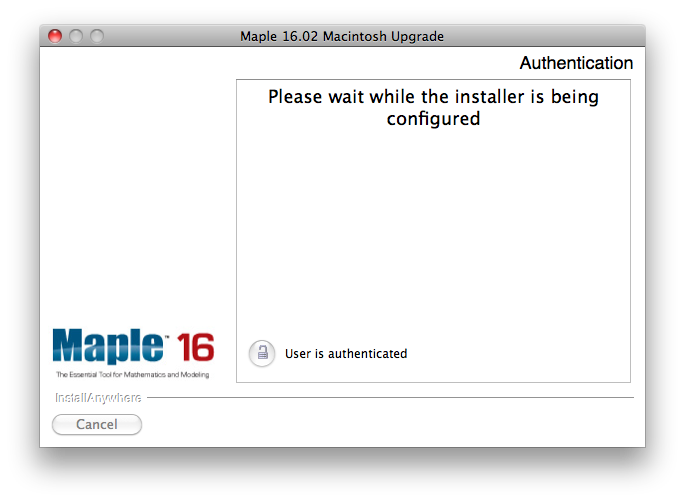 When I launch Maple1602MacUpgrade program the Authentification window open, I unlock entering my admistrator password, OK, then the installer display "Please wait while the installer is being configured"... the progression bar is displayed, and at the end an empty window (window content is uniformly grey) is displayed with only a "Next" button in the bottom right of this window.