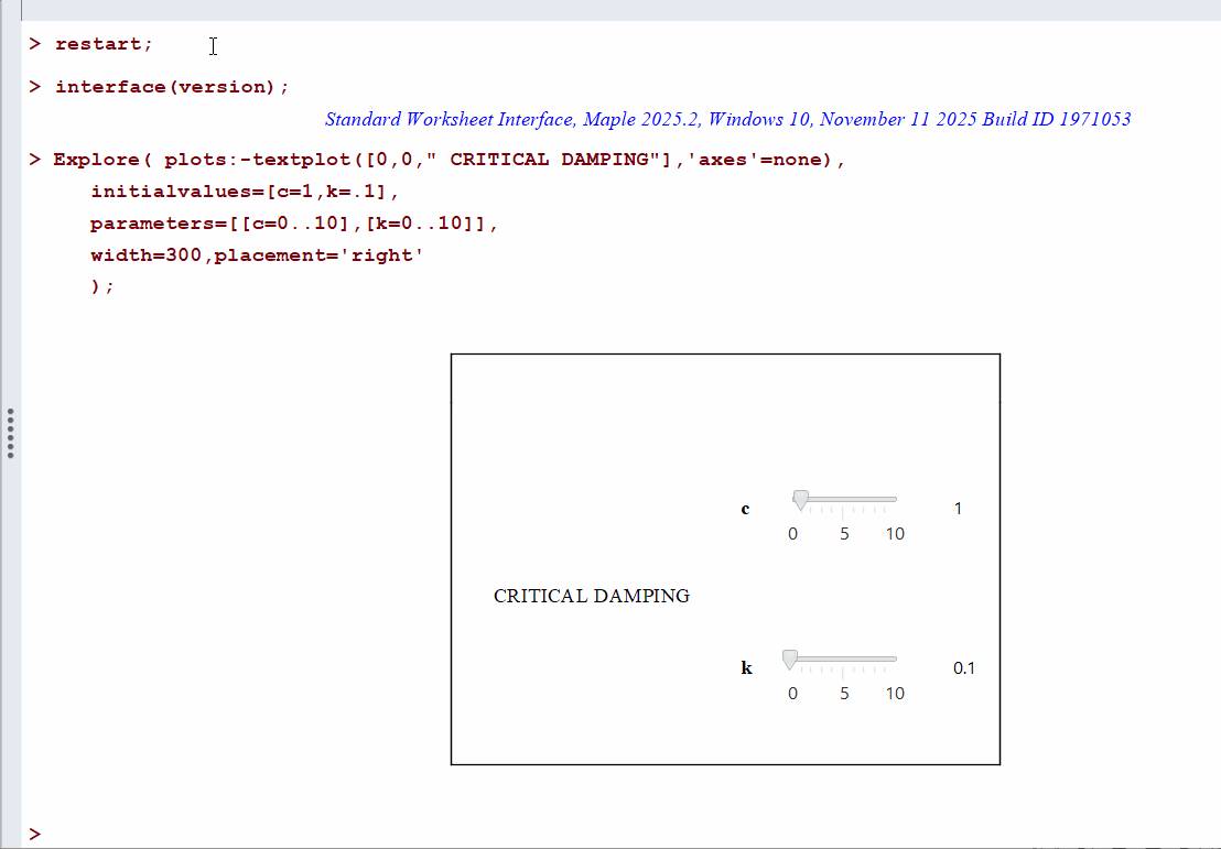 Explore( plots:-textplot([0,0," CRITICAL DAMPING"],'axes'=none),