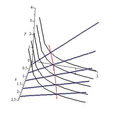 [implicitplot3d([y = 1/x, y = 2*x/(1+2*z)], x = 0 .. 3, y = 0 .. 4, z = 0 .. 2.5, numpoints = 1000, contours = 5, style = contour, thickness = 2, color = black, axes = normal),