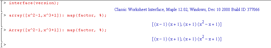 Classic Worksheet Interface, Maple 12.02, Windows, Dec 10 2008 Build ID 377066