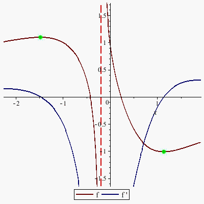 Your second question: Plotting a rational function, its derivative, vertical asymptotes, and critical points.