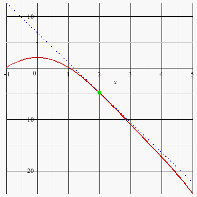 plot([f(x), D(f)(a)*(x-a)+f(a)], x= a-r..a+r, color= [red,blue], linestyle= [solid,dot]);