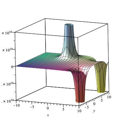 plot3d(VectorCalculus:-Divergence(E), x= -10..10, y= -10..10, view= -2*10^10..2*10^10);