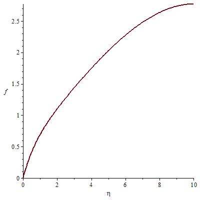 plots:-odeplot(Sol, [eta, f(eta)], 0..10, thickness= 2);