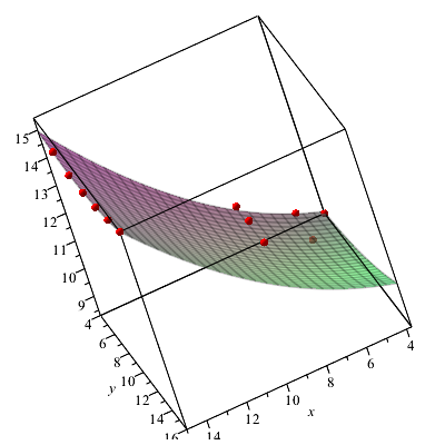 Statistics:-ScatterPlot3D(A^%T, lowess, bandwidth=2, showpoints= false, transparency= .3),