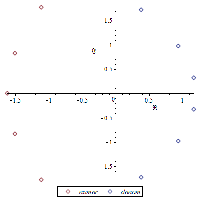 Okay, here is a point plot in the complex plane of the roots of the numerator and denominator.