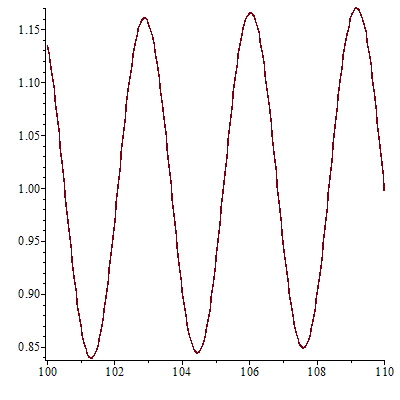 plot(R-> Int(r*BesselJ(1,r)*BesselJ(0,r), r= 0..R, digits=4), 100..110);