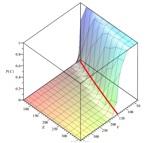 In the plot, I would've liked to see the numbers of vertices and edges on the axes. In the code below I regenerate the plot with this information. Otherwise, the plot uses the same parameters as the original. I have also plotted the threshold function ln(|V|)*(|V|-1)/2 on the same plot. You can see that the plot models the threshold phenomenon nearly perfectly.