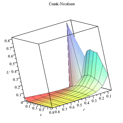 plots:-surfdata(M, 0.05..0.85, 0.05..0.85, labels= [t,x,U], axes= boxed, title= "Crank-Nicolson");