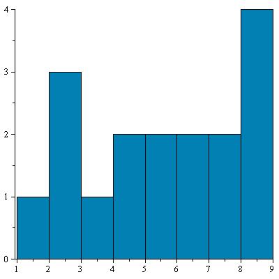 POLYGONS([[1., 0], [2., 0], [2., 1], [1., 1]], [[2., 0], [3., 0], [3., 0], [2., 0]], [[3., 0], [4., 0], [4., 1], [3., 1]], [[4., 0], [5., 0], [5., 2], [4., 2]], [[5., 0], [6., 0], [6., 1], [5., 1]], [[6., 0], [7., 0], [7., 1], [6., 1]], [[7., 0], [8., 0], [8., 1], [7., 1]], [[8., 0], [9., 0], [9., 4], [8., 4]], COLOUR(HSV, .5476190475, 1.000000000, .7000000000))
