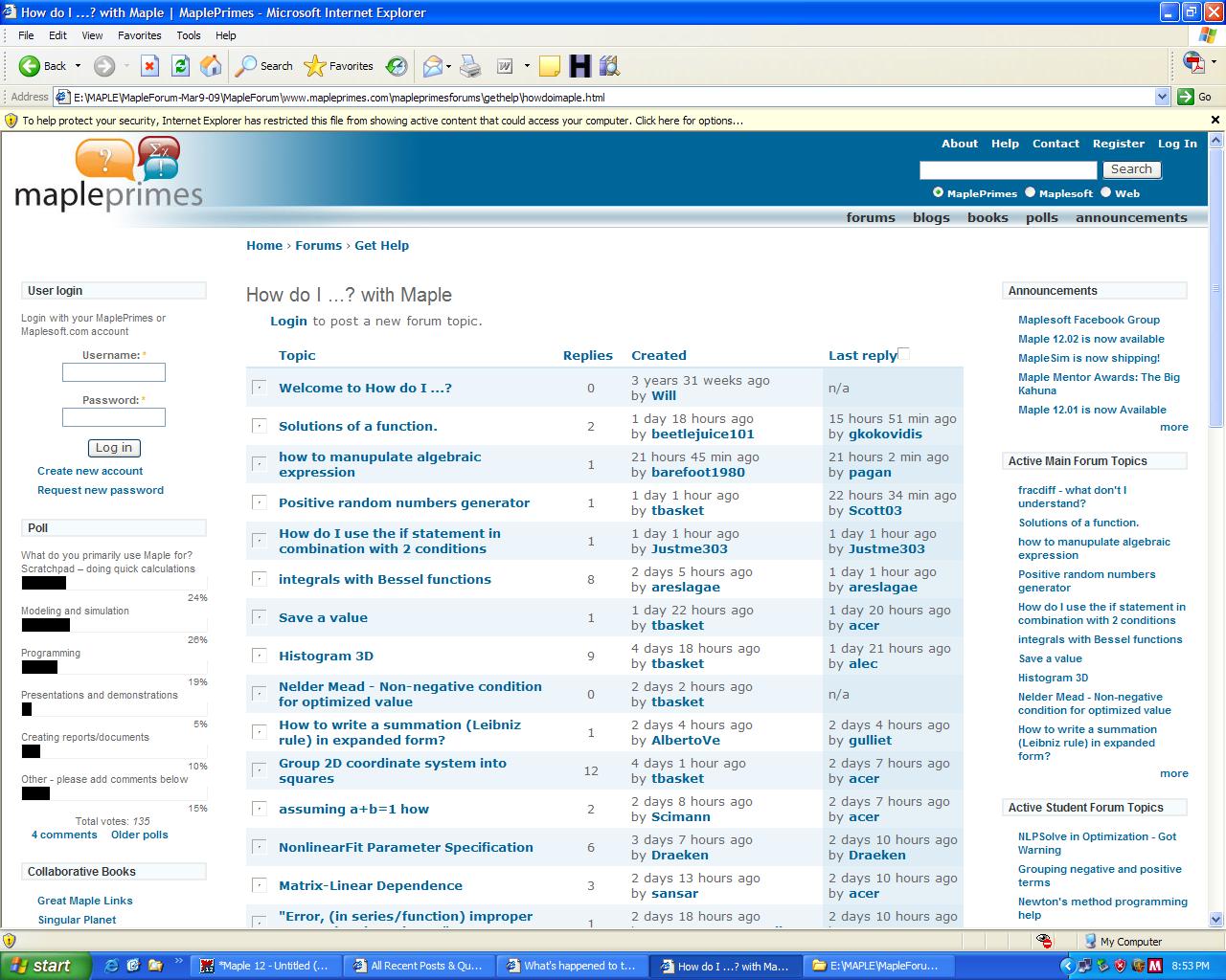 Some of the things I liked about it.  The User login was right there on that page.  You didn't have to navigate somewhere else to log in.  The poll questions that existed on the left hand side, and on the bottom left, collaborative books with Great Maple Primes links under one heading.   The date posts were created so you knew how long ago that question was started.  And it was quick!