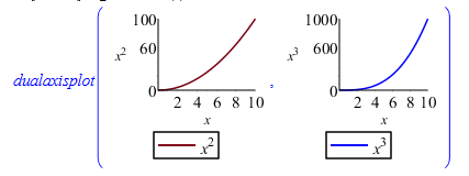 dualaxisplot(plot(x^2, x = 0 .. 10, labels = [x, x^2], legend = x^2), plot(x^3, x = 0 .. 10, color = blue, labels = [x, x^3], legend = x^3));