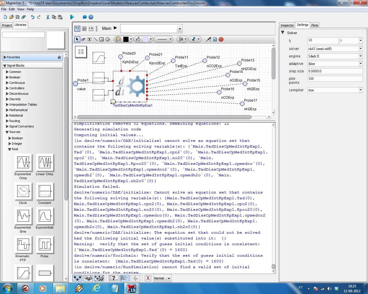 The model that i uploaded (EqQui.msim) has a component with severall output and 4 inputs, but 2 of the inputs (LgKph2o and Lgkpco2) depends on one of the outputs. The 2 interpolation tables transfor the output variable (temperature) in this two inputs. All components works fine independtly (first "model", the one on the top), but if i link the exit of both interpolation tables mapleSim say it cant solve a lot of variables.