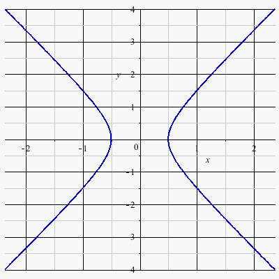 abs(((x-1)^2+y^2)^(1/2)-((x+1)^2+y^2)^(1/2)) = 1