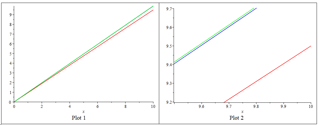 P2:=display(p1,p2,p3, view=[9.5..10,9.2..9.7],caption="Plot 2", captionfont=[times,16]);