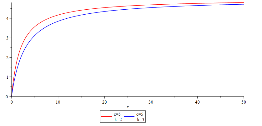 plot([f(x,5,2), f(x,5,3)], x=0..50, color=[red,blue], legend=["c=5 \n k=2","c=5 \n k=3"], size=[800,400]);