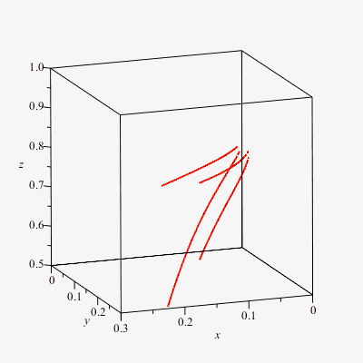 plots:-intersectplot(4*x^2*y^6-6*x^3*y^4-2*x^2*y^5-4*x*y^6+4*x^4*y^2+2*x^3*y^3+5*x^2*y^4+x*y^5+y^6-4*x^4*y+x^3*y^2-3*x^2*y^3+x^4=0, 16*x^2*z^6-24*x^3*z^4-16*x*z^6+9*x^4*z^2+14*x^2*z^4+4*z^6-x^3*z^2-16*x^2*z^3+2*x*z^4+12*x^3*z-x^2*z^2+16*x*z^3-7*x^2*z-4*z^3+4*x^2-x*z-4*x+1=0, x=0..0.3,y=0..0.3,z=0.5..1, numpoints=10000);