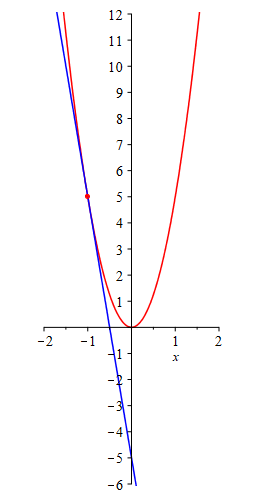 plot([y(x), Tang, [[x0,y(x0)]]], x=-2..2, -6..12, color=[red,blue,red], style=[line,line,point], symbol=solidcircle, symbolsize=12, tickmarks=[default,spacing(1)], size=[200,500]);  # The plotting