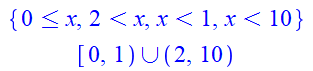 `union`(solve({x^2-3*x+2>0, x>=0, x<10}));