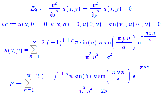 bc:=u(x,0)=0, u(x,a)=0, u(0,y)=sin(y), u(infinity,y)=0;