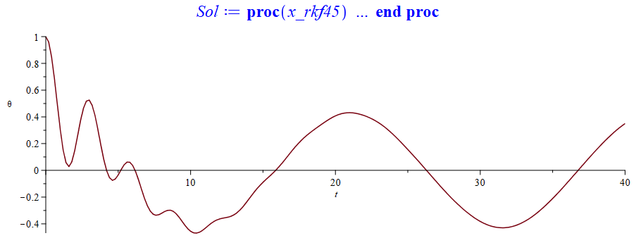 Sol:=dsolve({m*l*diff(theta(t),t,t)+b*diff(theta(t),t)+m*g*sin(theta(t))=A*cos(omega*t), theta(0)=1, D(theta)(0)=0}, theta(t), numeric, parameters=[m,l,g,b,A,omega]);