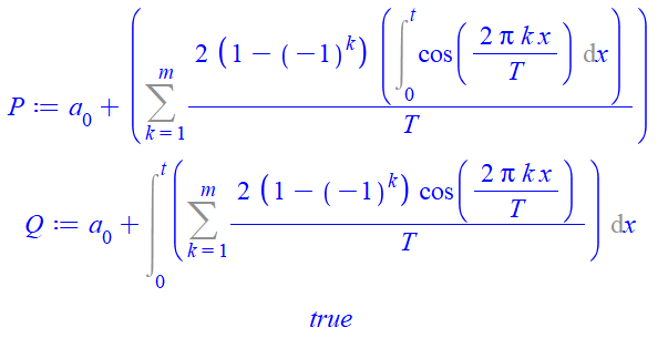P := a[0]+Sum((2*(1-(-1)^k))/T*(Int(cos(2*Pi*k*x/T), x = 0 .. t)), k = 1 .. m);