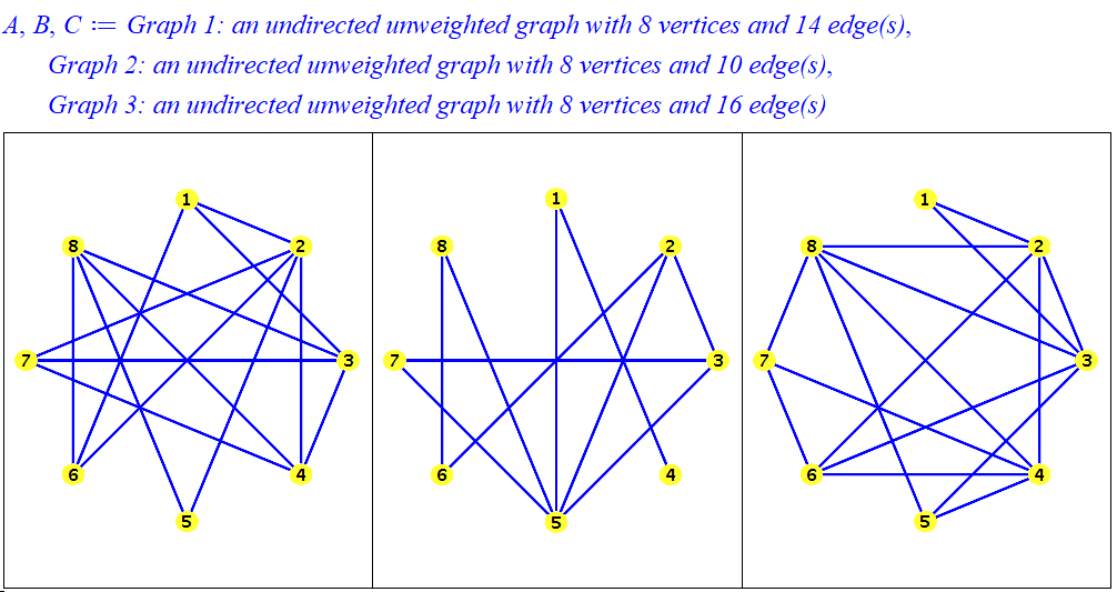 A,B,C:=seq(RandomGraphs:-RandomGraph(8, 0.5), i=1..3);