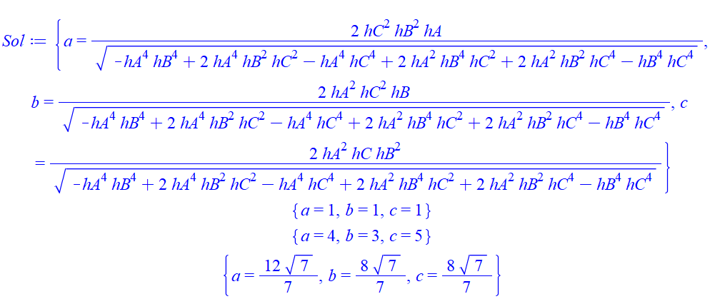 Sol:=[solve({hA=2*S/a, hB=2*S/b, hC=2*S/c}, {a,b,c}, explicit)][2];
