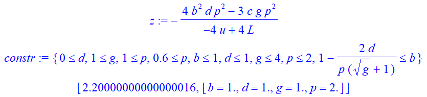 constr:={ 1-(2*d)/(p*(sqrt(g)+1))<=b, b<=1, 0<=d, d<=L, c<=p, p<=u, 1<=g, g<=4};