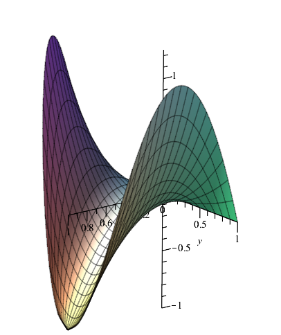 plot3d(4*x*y^2-x^2, x=0..1, y=-sqrt(1-x^2)..sqrt(1-x^2), scaling=constrained, numpoints=10000, axes=normal);