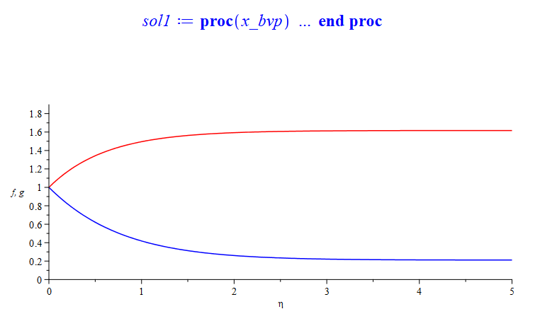sol1 := dsolve([diff(diff(diff(f(eta), eta), eta), eta)+f(eta)*(diff(diff(f(eta), eta), eta))-(diff(f(eta), eta))^2 = 0, diff(diff(diff(g(eta), eta), eta), eta)+f(eta)*(diff(diff(g(eta), eta), eta))+2*g(eta)*(diff(diff(f(eta), eta), eta))-3*(diff(g(eta), eta))*(diff(f(eta), eta)) = 0, f(0) = 1, (D(f))(0) = 1, (D(f))(5) = 0, g(0) = 1, (D(g))(0) = -1, (D(g))(5) = 0], numeric, method = bvp);