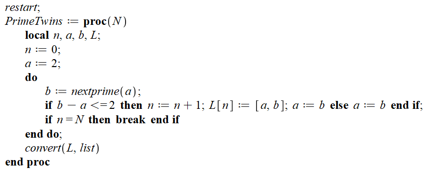 Here is the code of a simple procedure that searches for the N first pairs of prime twins.