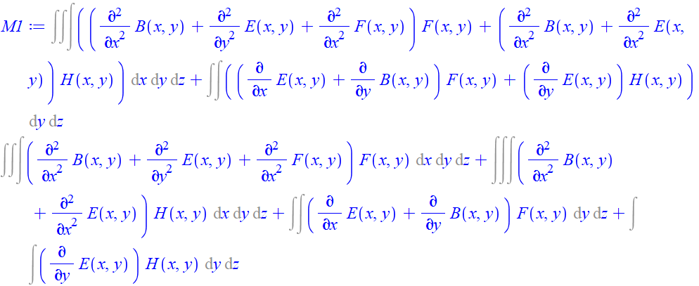 M:=Int(diff(B(x,y),x,x)*F(x,y),[x,y,z])+Int(diff(E(x,y),x,x)*H(x,y),[x,y,z])+Int(diff(E(x,y),y,y)*F(x,y),[x,y,z])+Int(diff(B(x,y),x,x)*H(x,y),[x,y,z])+Int(diff(F(x,y),x,x)*F(x,y),[x,y,z])+Int(diff(E(x,y),x)*F(x,y),[y,z])+Int(diff(E(x,y),y)*H(x,y),[y,z])+Int(diff(B(x,y),y)*F(x,y),[y,z]):
