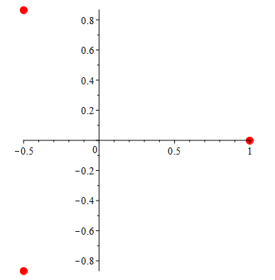 L := [-.500000000000000-.866025403784439*I, -.500000000000000+.866025403784439*I, 1.]