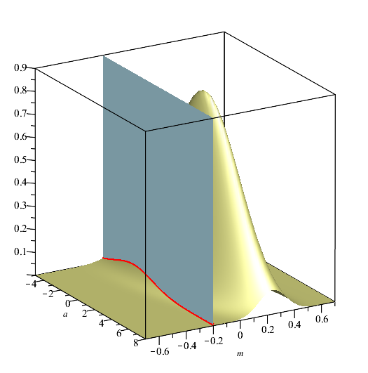 B:=plot3d(PP, a = -5 .. 8, m = -0.7 .. 0.7, style=surface, color=khaki, numpoints=5000):