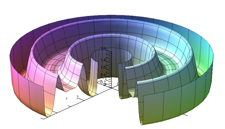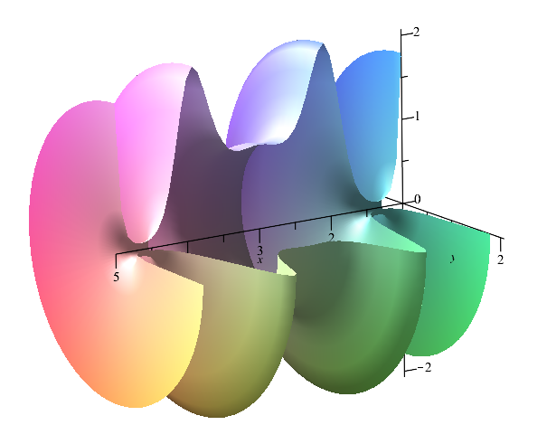 plot3d([r*cos(phi), r*sin(phi), f(r)], r=1..5, phi=Pi/3..2*Pi, scaling=constrained, axes=normal);