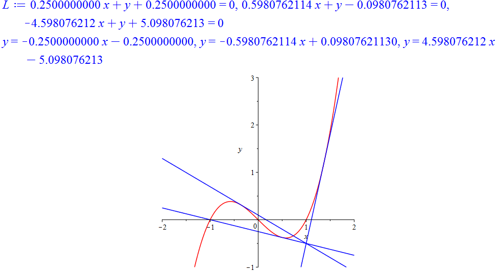 L:=Tangents(y-x^3+x, [1,-0.5]);  # The tangents lines in the implicit form