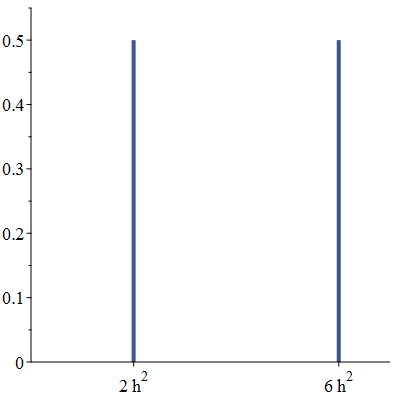 Statistics:-Histogram([2, 6], discrete=true, thickness=4, tickmarks = [[2=2*h^2, 6=6*h^2], default], view=[0..7, 0..0.55], axes=normal, axesfont=[times,roman,14]);