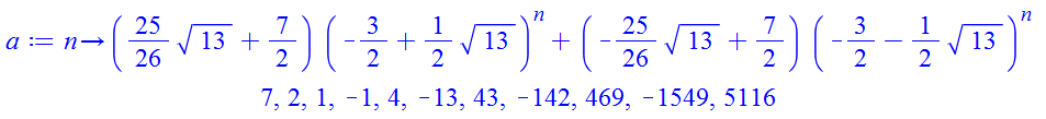 a:=unapply(rsolve({a(n)=-3*a(n-1)+a(n-2), a(0)=7, a(1)=2}, a(n)), n);